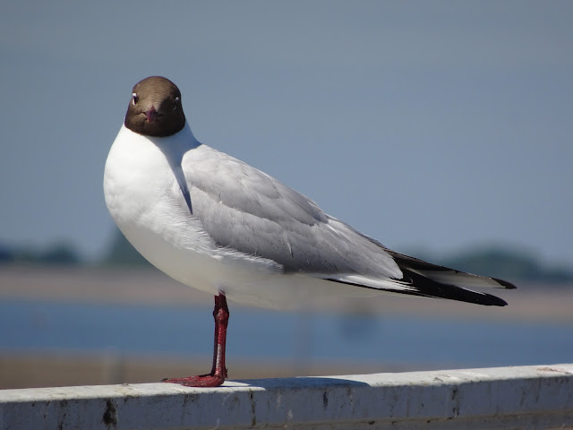 Auf dem Geländer halten sich auch ständig etliche Vögel auf und beobachten wie wir das Treiben. Noch mehr Vögel sitzen auf den Steinen unterhalb des Weges. Darunter viele Jungvögel, erkennbar weniger an ihrer Größe, sondern an ihrem dunklen Federkleid. Die ausgewachsenen Lachmöwen sind, ebenso wie die Küstenseeschwalben, weiß, bis auf ihre dunklen Köpfe. Die Seeschwalben haben einen lustigen schwarzen Kamm auf ihren Köpfen. Es ist schwer, sich hier wieder loszueisen.