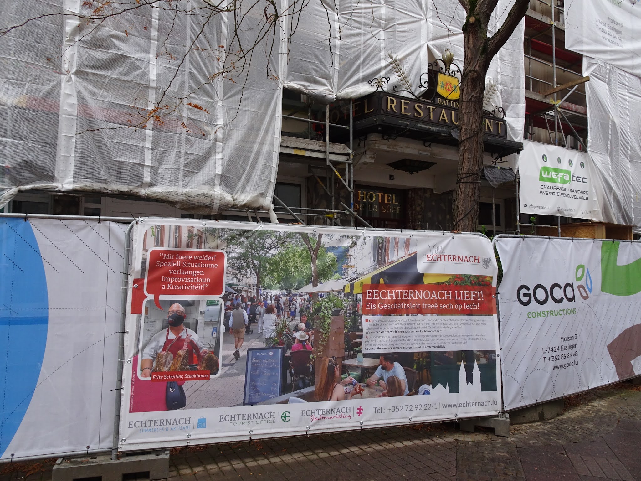 Beim Gang durch die Altstadt fallen die vielen Baustellen auf. Auch vor den Häusern stehen Bauzäune und Gerüste. Große Schilder klären uns auf über das, was wir nicht wussten: die Flutkatastrophe des aktuellen Jahres 2021, die wir besonders mit dem Ahrtal verbinden, fand auch in Echternach statt, als am selben Tag, dem 15. Juli 2021, die Sauer über die Ufer trat und Echternach überschwemmte. Jetzt ist der Wiederaufbau im Gange, und im besonderen die Inhaber:innen der Geschäfte in der Innenstadt versichern in einer Plakataktion, dass sie nicht aufgeben werden.